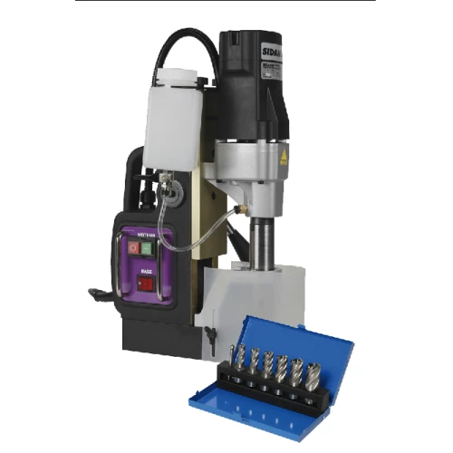 La perceuse à base magnétique 35PM+ de Sidamo est une machine compacte et robuste, conçue pour percer ou carotter l’acier. Cette perceuse est dotée d’une base à forte attraction magnétique de 15000 N. Elle est également munie d’un écran de protection, d’un réservoir à liquide de coupe intégré ainsi que d’une lubrification par le centre de l’outil.